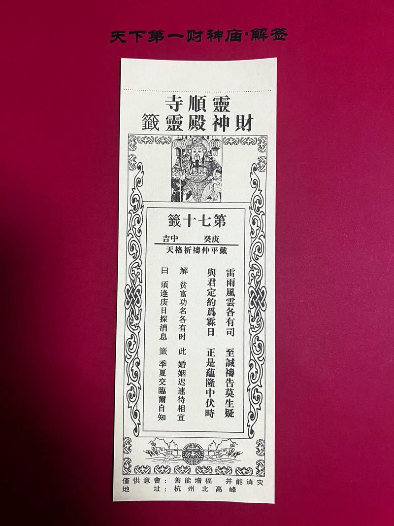 灵签上签文云:"财源滚滚入家门,金银满屋福禄存。逢贵景,富贵荣华享此生。"此签预示财运亨通,事业顺利。财神眷顾,财源广进,家宅盈满,福气满堂。抓住机遇,定能达成富贵荣华之愿。