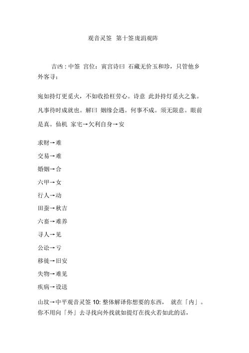 观音灵签第10签的卦辞通常为:“天与之财,事有转机,然需用心谋之,方能得福。”这一签文提供了关于财富、事业以及转机的具体指导。整体来看,第10签的主要内容涵盖了天赐之财、事物转机、用心谋划的重要性,以及如何在机遇中把握成功。
