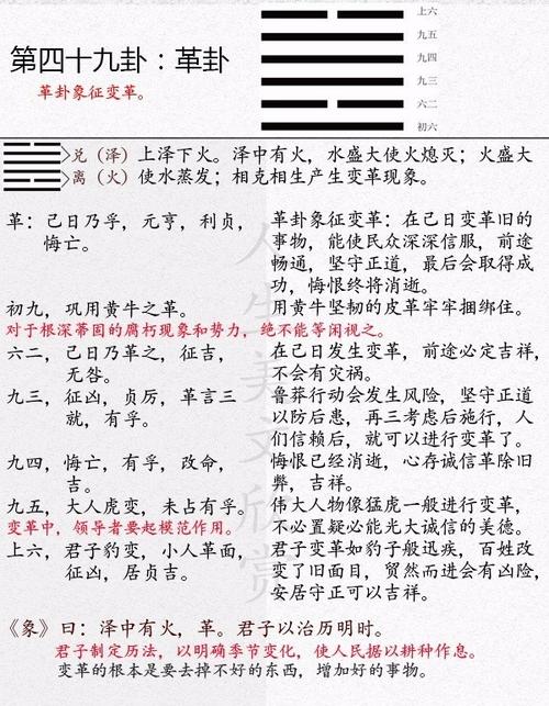 易经革卦灵签旨在指引占者在变革时期做出明智选择。上上签预示着顺利变革,上签鼓励主动求变,中签提醒审时度势,下签告诫谨慎变革。变爻灵签则针对不同爻位给出具体指引,帮助占者趋吉避凶。占得此卦者,当顺应天时,积极革故鼎新,方能把握机遇,成就辉煌。