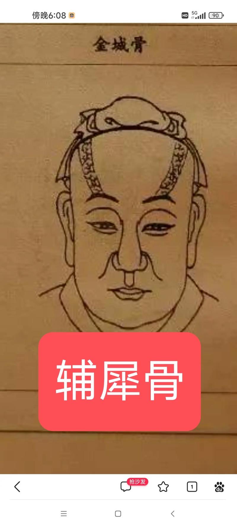 伏犀骨一般位于前额正中偏上,从印堂开始向上隆起,形似犀牛角。其形状可粗可细,长短亦有差异。通常认为,伏犀骨越粗壮、越长,其人福气越旺。