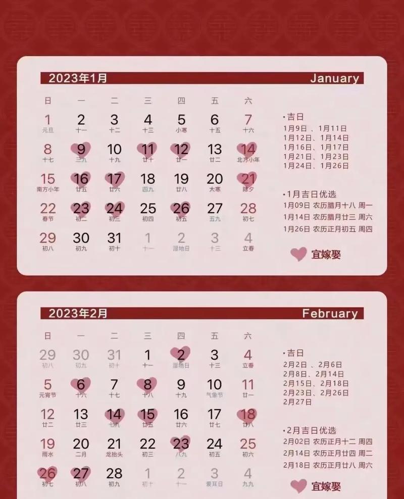 传统文化中,结婚黄道吉日通常基于八字合婚和通胜择日。八字合婚考虑新人的生辰八字是否相合,而通胜择日则根据阴历、节气、干支等因素选择吉利的日子。以下是一些常见的中国传统黄道吉日: