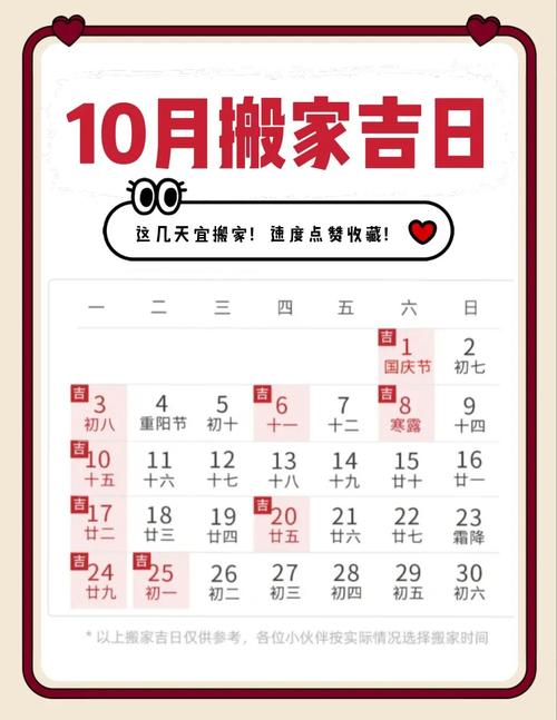 搬家是一项重大事件,选择一个有利的吉日可以为您的新居带来好运和繁荣。在公历十月,以下日期是搬家吉日: