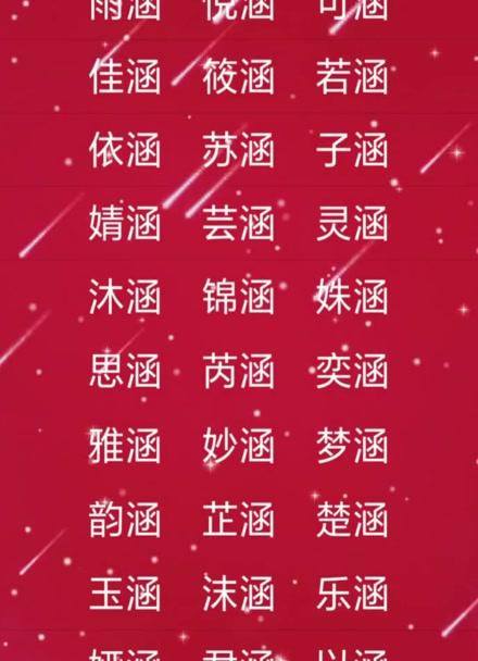 为女宝宝起一个涵字名,不仅寓意深远,而且好听悦耳,既寄托了父母的期望,也为宝宝带来福气和好运。父母在为宝宝取名时,可以参考这些涵字名,为她选择一个满载祝福和美好的名字。