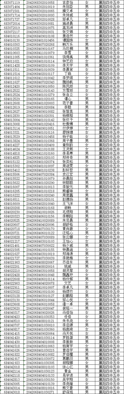 襄阳市第三中学2021年录取名单也已公布。根据学校公告,今年第三中学共招收了635名学生,包括296名文科学生和339名理科学生。以下是一些入学名单: