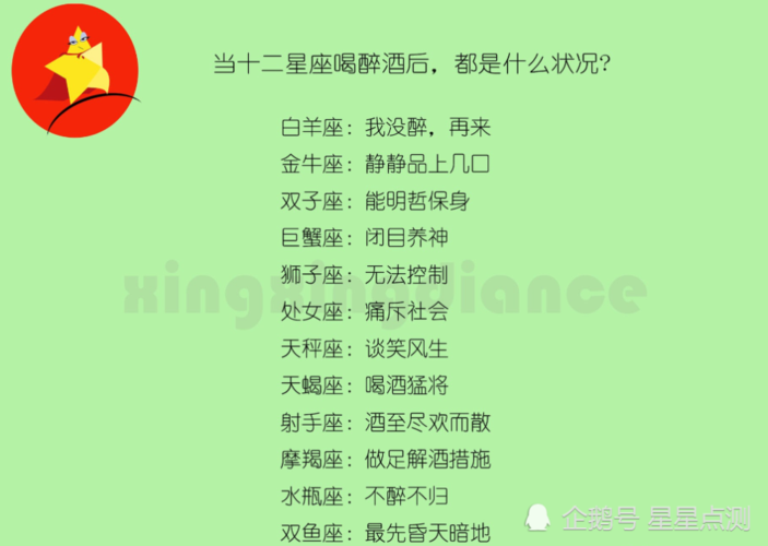 不管是哪个星座,喝醉后都会有不寻常的表现。有时候这些表演被别人嘲笑,有时候会让身边的人围着你转。但是喝醉了,最重要的是保护好自己,不要让自己受到任何伤害。