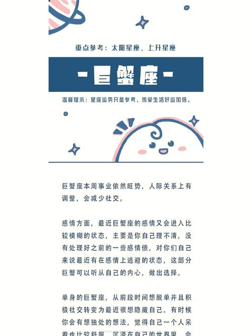 巨蟹座最近的运势发生了一些变化。在此期间,巨蟹座需要抓住当前的机遇,做出“稳定”的决定,尽最大努力把握这一时期,才能在未来获得正确的方向。
