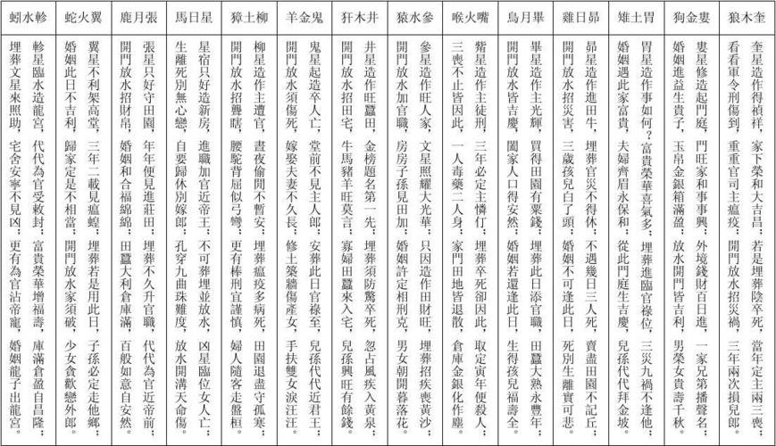 星宿星宿吉凶表:大凶,忌丙思月出行,求病,安葬。小吉,忌乙酉月出行,求财。