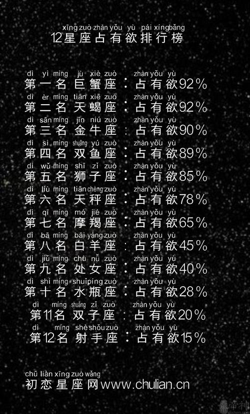 射手座排名第十二射手座是一个乐观向上的星座。他们不太关心自己的情感表现,希望有自由和冒险的生活体验。因此,在爱情中,射手座并没有表现出非常强烈的占有欲。他们希望互相探索和分享世界的美。