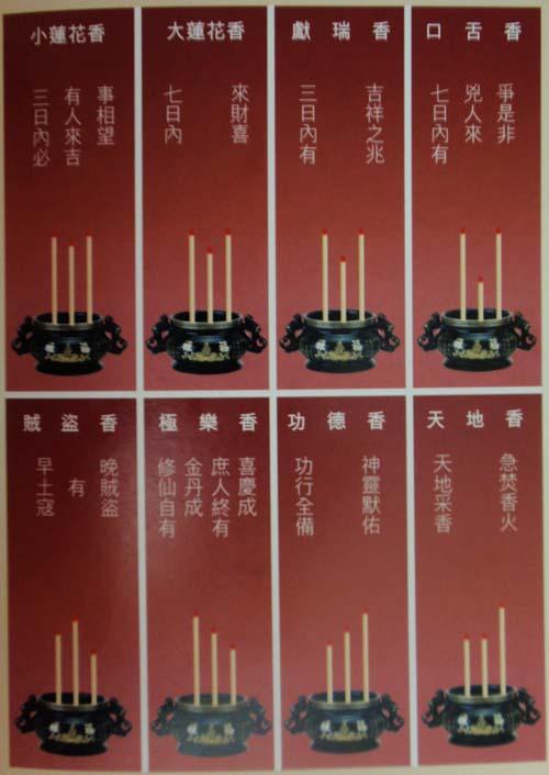 6.有问题的香是香、香、偏香、熄灭香、不旺香、灰黑香、异形香烟香等。相应的香水位置有问题。