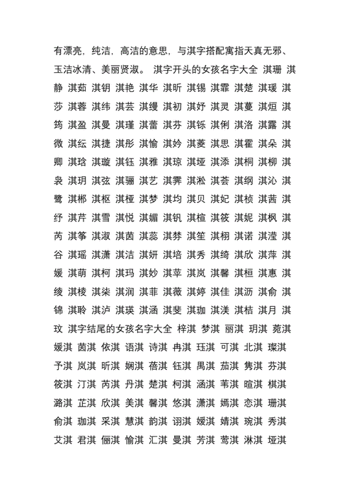 祺,多用于人名或商务信函。本义指吉祥,安祥。书信中用于祝颂语。如近祺、文祺、时祺。以祺字给女孩取名是希望孩子快乐幸福,无忧无虑,能获得安稳宁静的生活。琪,拼音为qí,是美玉的一种,亦有花草繁盛的意思;比喻珍贵之物。女孩用琪字取名的寓意是娇俏可人,天资聪慧,品格珍贵。父母希望女孩平安健康,可以用祺字取名表达祝福意愿;若希望女孩美丽明艳,可以用琪字取名表达赞美、期待的愿景。