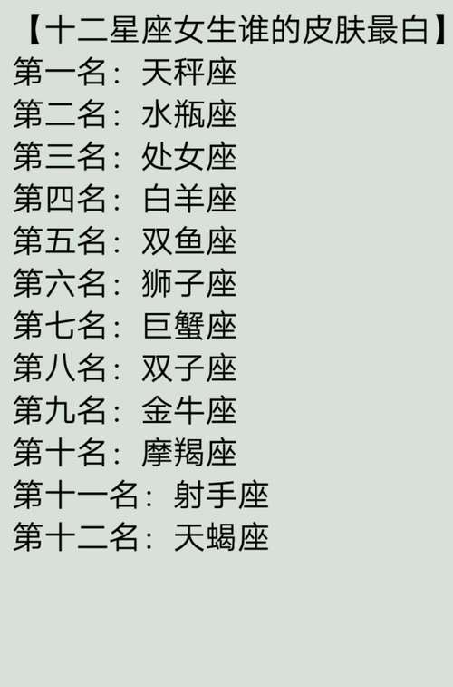 白羊座白羊座是十二星座中皮肤较白的星座之一,皮肤较黄的皮肤颜色一般更容易受到外部环境的影响而变暗。因此,白羊座的人需要注意日常的皮肤保养,经常洗脸,使用一些有美白效果的产品,注意不要长时间暴露在阳光下,提高使用防晒霜的频率。