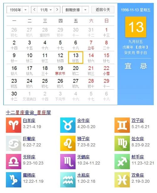 星座是根据阳历计算的。好将你的农历生日转换为当天的阳历,然后通过阳历了解你的星座。以下是每个星座的对照表: