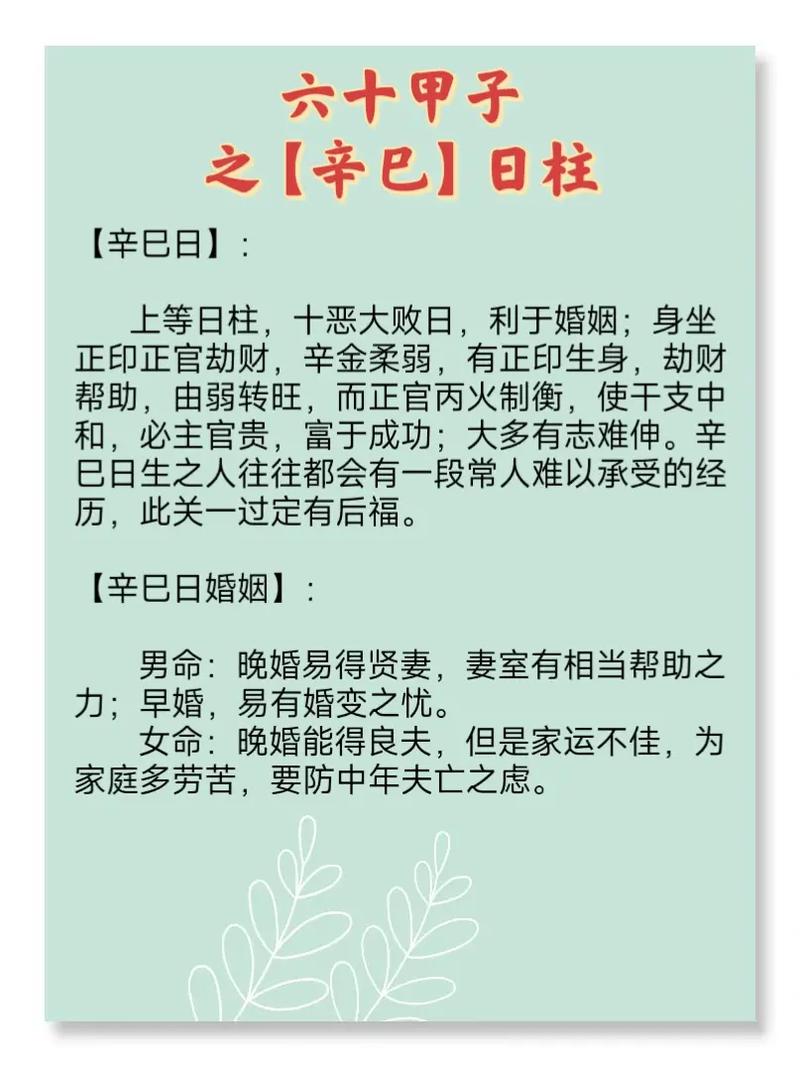 传统命理学中,八字命盘揭示了一个人的命运轨迹。而辛巳日柱女命,更是其中颇具魅力的一类。她们的性格特征、人生经历与命运走向,往往充满了神秘色彩。接下来,我们将深入探讨辛巳日柱女命的独特性,揭示她们在生活、事业和感情方面的特点。