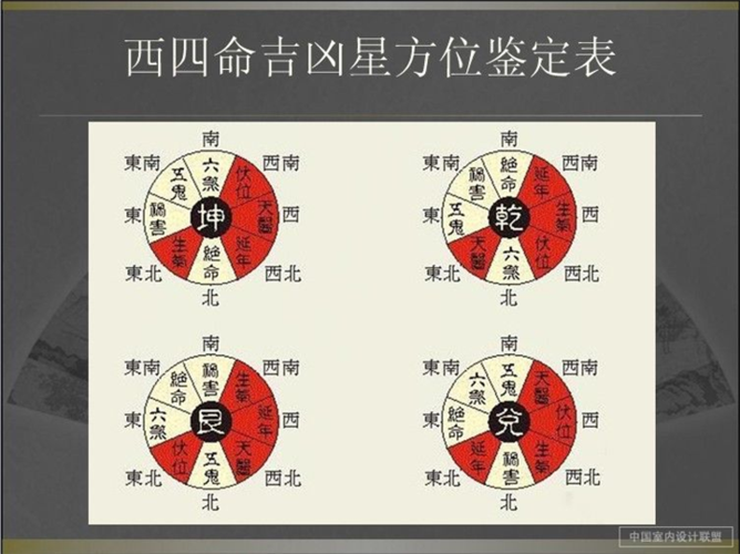 2. 西四命吉凶方位表:以下是常用的西四命吉凶方位表: